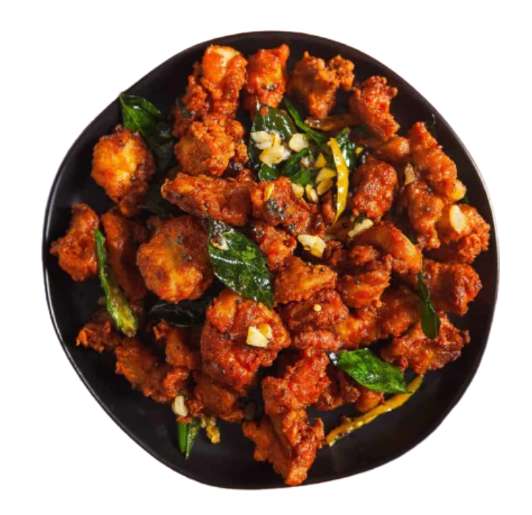 A South Indian specialty featuring crispy chicken bites flavored with mustard seeds, curry leaves, and dry red chilies for a tangy, spicy kick.