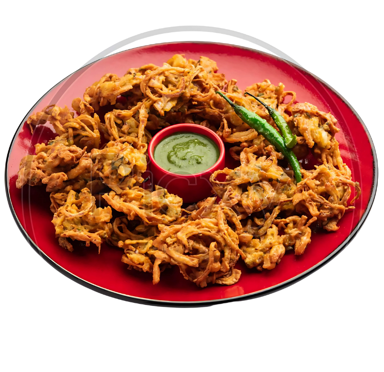 Thinly sliced onions coated in chickpea flour, flavored with carom seeds and spices, then deep fried until crisp and golden.