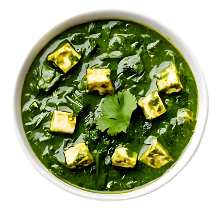 Tender paneer cubes cooked in a smooth spinach gravy with mild spices, offering a wholesome and nutritious flavor.