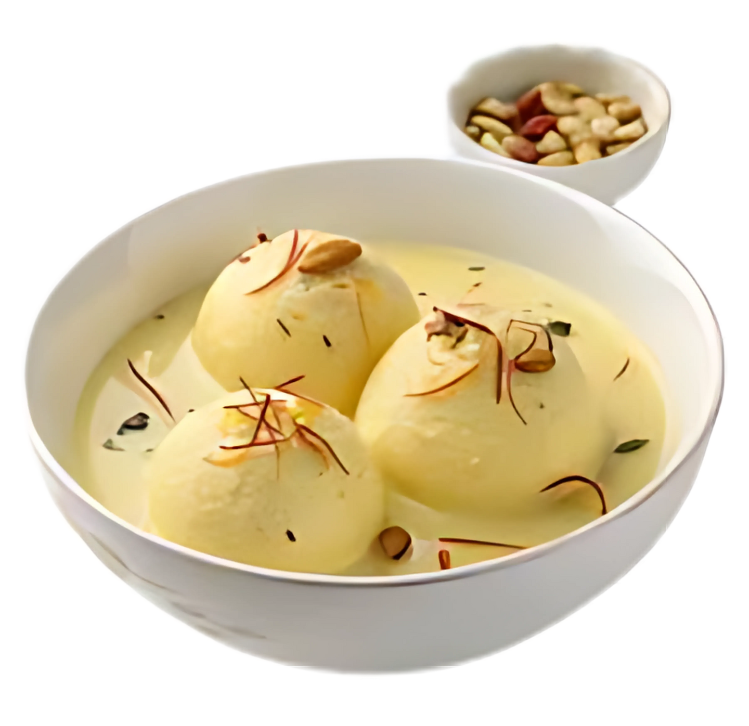 Delicate cottage cheese dumplings soaked in sweet, cardamom-infused milk and topped with nuts for a creamy, indulgent dessert.
