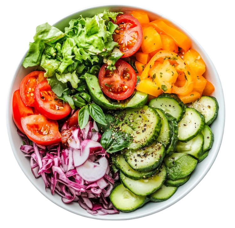 A fresh mix of diced onions, tomatoes, cucumber, green chilies, and coriander, tossed with lemon juice and mild spices.