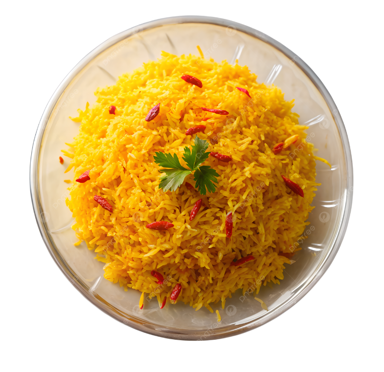 Fragrant basmati rice infused with saffron strands, giving it a delicate aroma, golden hue, and subtle flavor.